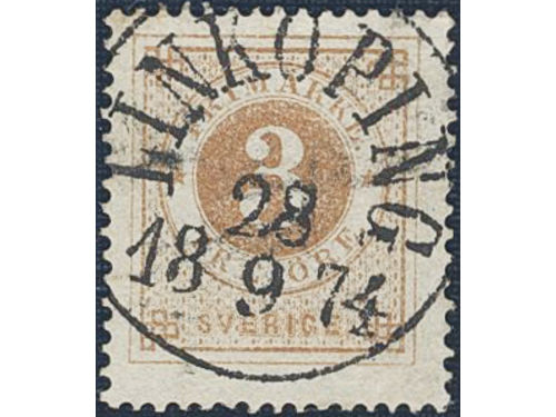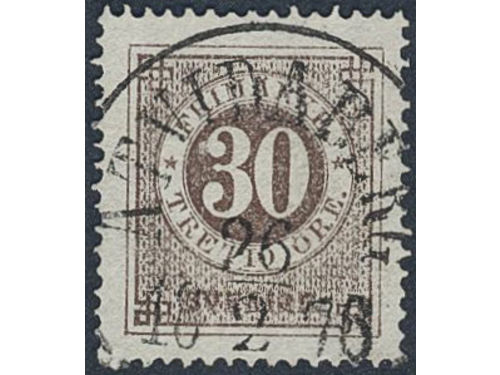 Sweden. Facit 25h used, 30 öre greyish brown. EXCELLENT cancellation MARIESTAD 4.9.1876. Very small pre-printing paper fold ("dragspel").