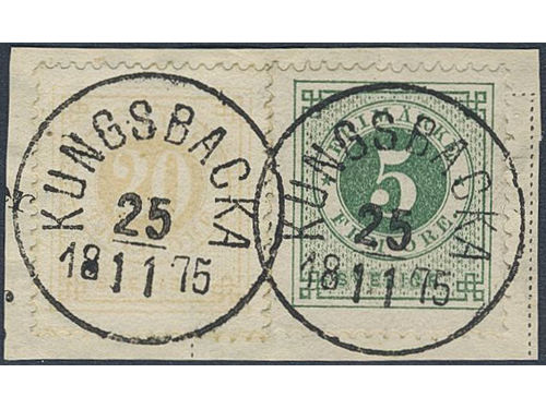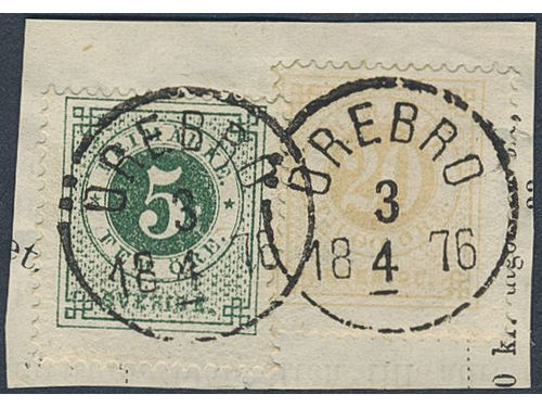 Sweden. Facit 22f, 19 on piece, 20 öre pale orange + 5 öre on very beautiful cut piece cancelled ÖREBRO 3.4.1876. Show less
