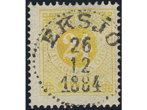 Sweden. Facit 34i used, 24 öre lemon-yellow on soft paper. Beautiful copy cancelled EKSJÖ 26.12.1884. However cancellati..