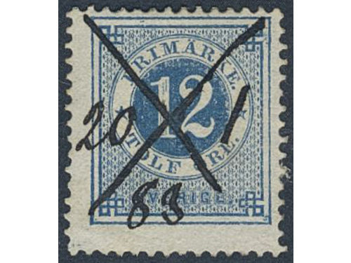 Sweden. Facit 32h ★★, 12 öre dark blue–light blue on calendered paper. Very fine and fresh, never hinged copy with opinion (shade) by O.P.