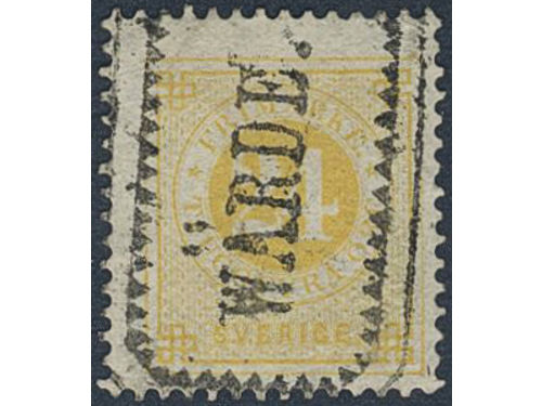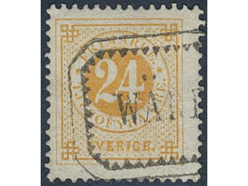 Sweden. Facit 34 used, 24 öre yellow. With an almost complete WÄRDE-pmk. Scarce.
