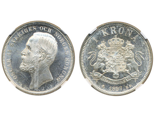 Coins, Sweden. Oskar II, MIS III.2, 1 krona 1897. Graded by NGC as MS64. 01/0.