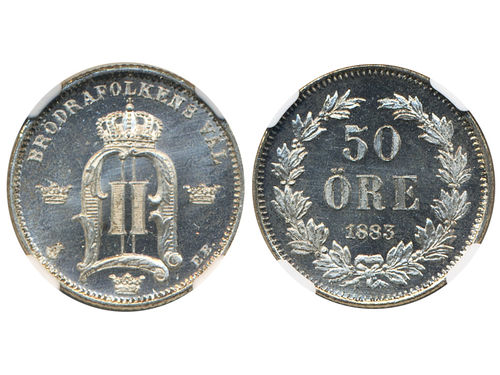 Coins, Sweden. Oskar II, MIS I.7, 50 öre 1883. Superb example with mirror-like surfaces. Graded by NGC as MS66. SM 86. 0.