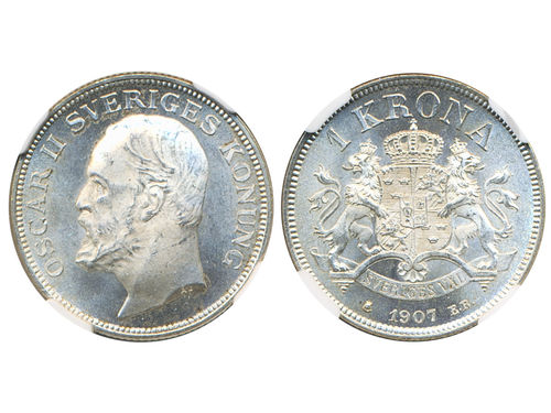 Coins, Sweden. Oskar II, MIS IV.2, 1 krona 1907. Graded by NGC as MS65. SM 80. 0.