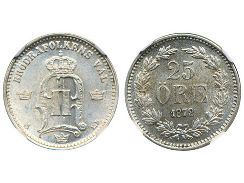 Coins, Sweden. Oskar II, MIS I.6b, 25 öre 1878. Graded by NGC as MS64. SM 95a. 01/0.