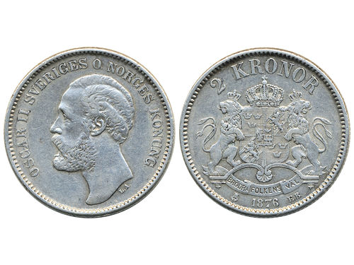 Coins, Sweden. Oskar II, MIS I.1a, 2 kronor 1876. Wide date, large EB. Drill mark in reverse. SM 44a. 1?/1. Show less