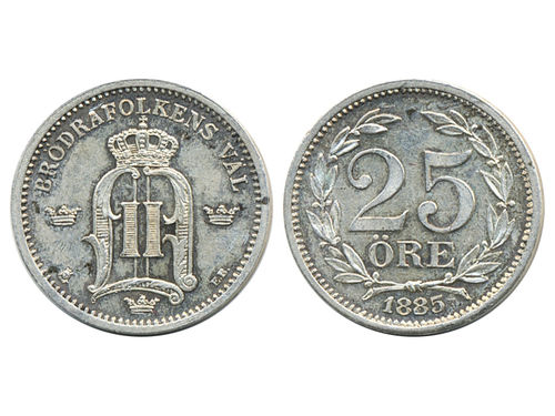 Coins, Sweden. Oskar II, MIS I.6a, 25 öre 1878/7. Scarce overdate. Cleaned. 1/1+. Show less