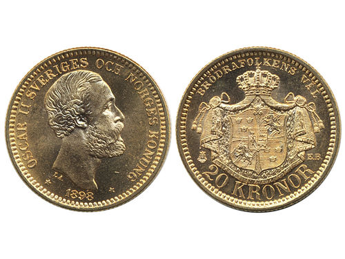 Coins, Sweden. Oskar II, MIS III.12, 20 kronor 1895. Beautiful example with some handling marks and prooflike fields. Graded by PCGS as MS65PL. 01/0.