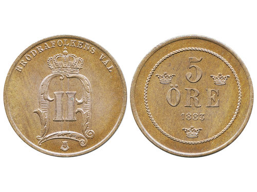 Coins, Sweden. Oskar II, MIS I.28b, 5 öre 1897. Superb example with full lustre in surfaces. A miniscule verdigris spot. SMB 166. 0.