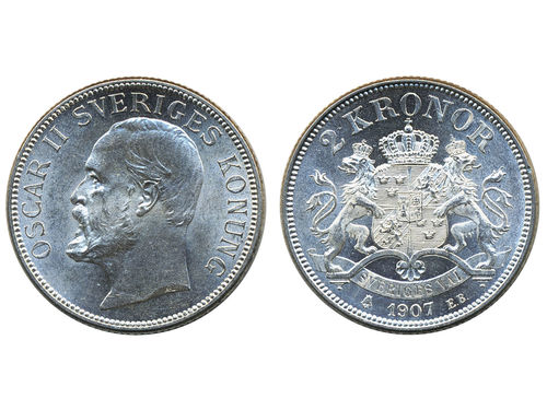 Coins, Sweden. Oskar II, MIS V.2, 2 kronor 1907. Beautiful lustrous example with minor handling marks. 01/0.