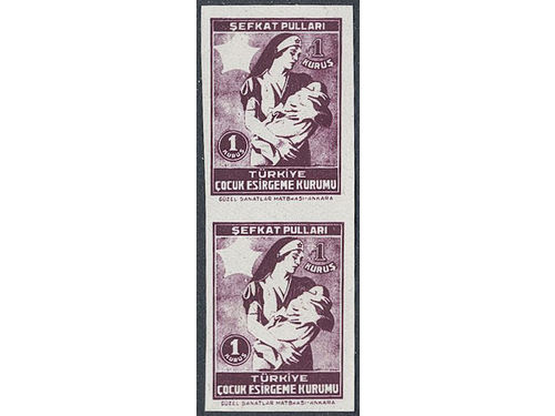 Turkey. Proof Michel 100 (★), 1946 1 k lilac-brown imperf. vertical pair without gum and red star. Turkey. Proof Michel 100 (★), 1946 1 k lilac-brown imperf. vertical pair without gum and red star. Show less