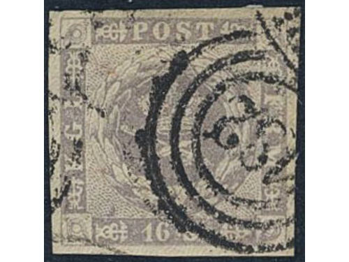 Denmark. Facit 6 used, 1857 Skilling 16S. grey-violet. A fine copy of the issue 1854. Cert: Kaiser (1981). SEK 1800