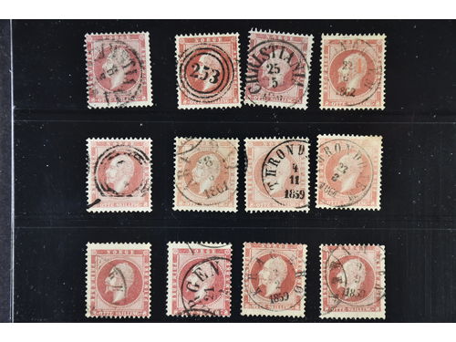 Norway. Lot used 1856–1857 on stock cards. Oscar II, 4 skilling, twelve copies with different cancellations. Mostly good quality. (12)