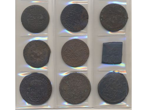 Coins, Sweden. Lot of twelve copper coins Gustav II Adolf–Adolf Fredrik + Swedish possessions, three silver coins Erik XIV–Karl XI. The entire lot is presented at www.philea.se. Show less