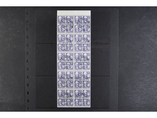 Sweden. Facit 259 used, Section of a stamp sheet with Swdenborg, 10 öre 40 stamps from the right side of the sheet, cancelled STOCKHOLM 29.1.1938. If separated it is possble to get 10 cancelled CB-pairs from the sheet. SEK 15 Show less