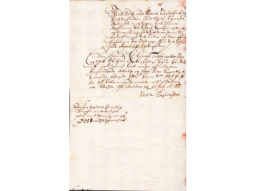 Autographs. MARIA EUFROSYNE of Zweibrücken (1625–1687). Princess of Sweden, sister of King Karl X Gustaf, cousin of Queen Kristina and married to Magnus Gabriel De la Gardie. Document (slightly cropped) regarding 584 daler copper coins signed 'Maria Euphrosina', dated Stockholm July 23, 1660. Show less