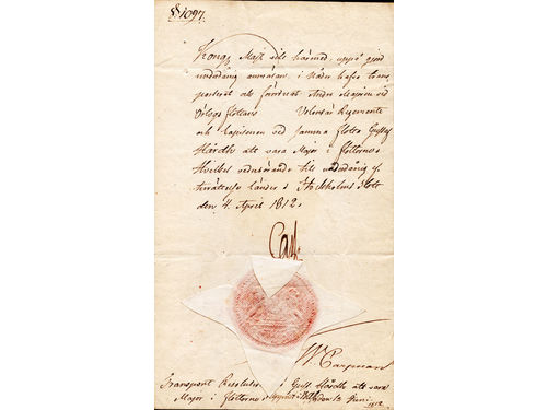 Autographs. Karl XIII (1748–1809–1818). King of Sweden. Decision/promotion for Captain Gustaf Hårdh to be a major. Dated Stockholm April 4, 1812, and with the King's signature. Show less