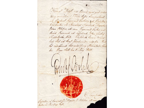 Autographs. Gustav IV Adolf (1778-1792-1809-1837). King of Sweden. Resolution dated Haga Palace May 4, 1805 and with the King's signature. Paper loss at the bottom. Transcription in Swedish enclosed. Show less