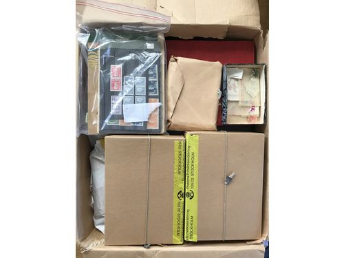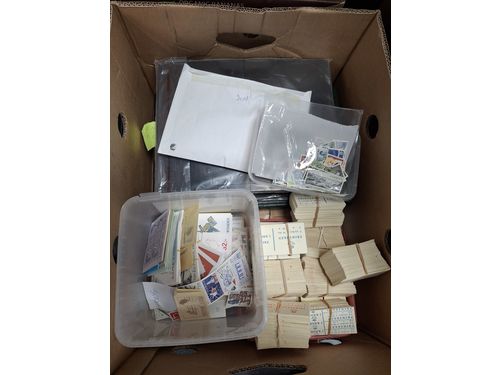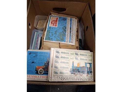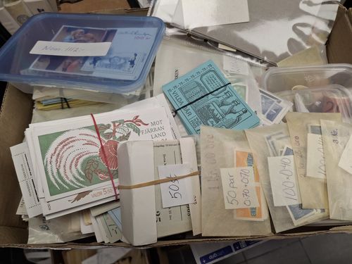 Sweden. Miscellaneous. Big box with 1000s of stamps in envelopes, albums and small boxes, 100s of FDCs, two sealed kilow.. Read more Sweden. Miscellaneous. Big box with 1000s of stamps in envelopes, albums and small boxes, 100s of FDCs, two sealed kilowares 1979 and one opened 1956, etc. Approx. 21 kg. Show less