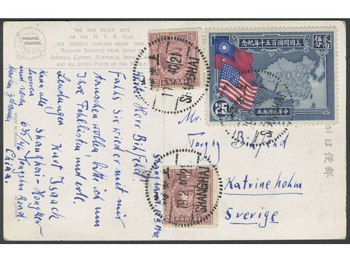 China, mixed. Covers 1938–1955. Two QXL cover from Radio Peking to Sweden 1954 and 1955. Cover 1943 via Siberia to Sweden sloppy opened. Cover to Sweden 1938 missing one stamp. The entire lot is presented at www.philea.se. Somewhat mixed quality. (4) Show less