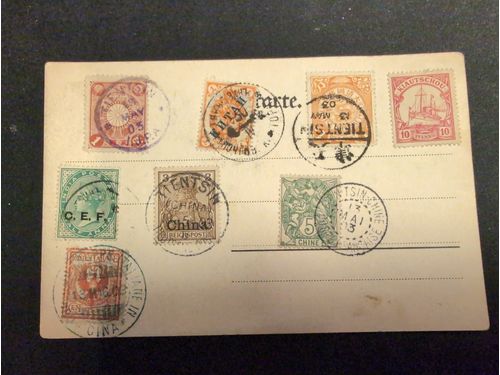 China, mixed. Cover. Postcard with stamps and cancels from all foreign post offices is Tientsin and with the Chinese with a 1c Coiling Dragon. All cancelled the same day 13 May 03. Show less