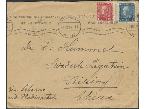 China, Incoming mail. Michel 177A, 183 on cover, Sweden. Cover sent from 15+25 öre on cover sent from STOCKHOLM 1 24.10.29 'via Siberia and Vladovostok' and SHANGHAI 13.NOV.29 to PEIPING 16.11.29. Show less