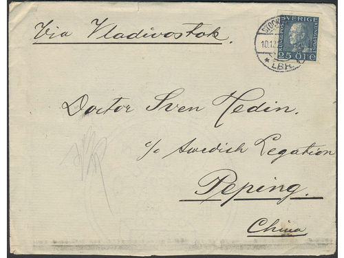 China, Incoming mail. Michel 183 on cover, Sweden. Cover sent from STOCKHOLM 10.12.29 'via Vladivostok' and HARBIN 8.JAN.30 to Sven Hedin, PEIPING 10.1.30. Show less