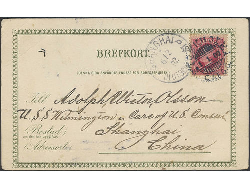 China, Incoming mail. Michel 54 on cover, Sweden. Postcard sent from STOCKHOLM 1.1.02 to SHANGHAI DEUTSCHE POST 6.2.02.