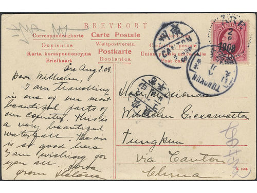 China, Incoming mail. Michel 54 on cover, Sweden. Postcard sent from ÅRE 2.8.1908 via CANTON 3.SEP to TUNGKUN. Show less