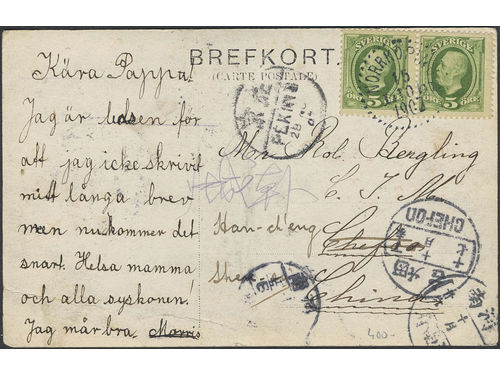 China, Incoming mail. Michel 52 on cover, Sweden. Postcard sent from NORRKÖPING 15.10.1907 to CHEFOO, then forwarded to Hancheng, Shaanxi. Show less