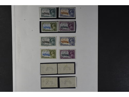 Cayman Islands. Michel 82–85 ★★/⊙, 1935 Coronation jubilee SET (4). Complete mint, superb used and the specimen perfins, all well displayed on the same album page. An attractive trio of sets. Show less