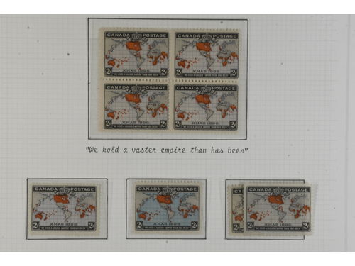 Canada. Collection ★/⊙ 1911–1937 on leaves. 1898 block of 4 UM with usual gum bends. 1911 KGV mixed mint and used with several better and some coils. E.g. SG207 used, 212 mh, 215 mh, 224b used, 255 mh, 262 UM and Newfoundland KGVI coronation set SG257–267 Please see a selection of scans at www.philea.se. Good quality. (79) Show less
