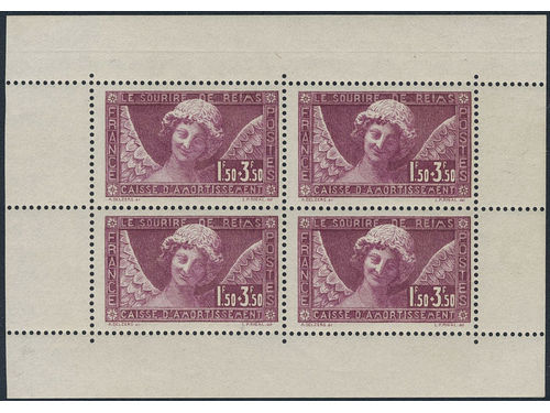 France. Michel 248 ★★, 1930 The Smile of Reims 1.50+3.50 Fr lilac (4). Block of 4 from booklet. EUR 480