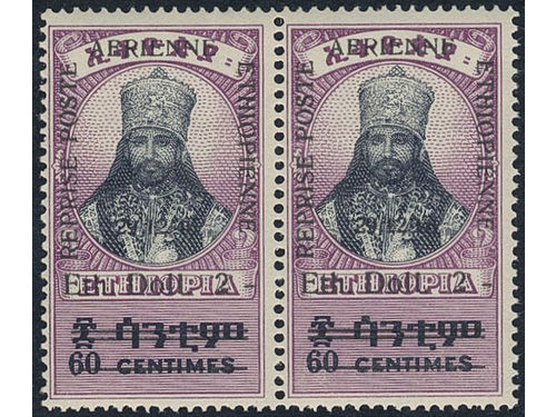 Ethiopia. Michel 224 ★★, 1947 Air mail service overprint $2 on 60 c lilac/blue-black in Pair. Scarce stamps. EUR 240 Show less