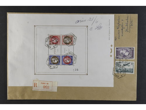 France. Michel 305+344 on cover, 1937 PEXIP Exhibition souvenir sheet 3 on registered cover to Stockholm. Show less