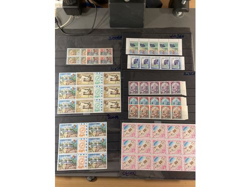 French colonies. ★★. Outstanding stock, virtually all mint never hinged sets, housed in two boxes, containing 100s of stockcards from countries such as Wallis and Futuna, French Polynesia - both these areas are very strongly represented – as well as good ranges of Djibouti, Comoros, Congo, St Pierre Miquelon, Mauritania, Mali, etc. The vast majority are not catalogued, however we can safely project a minimum catalogue in excess of 100,000 euro. There are a wide range of topics from Polynesian boats, omnibus, human rights, ancient art forms from islands, etc. From Wallis butterflies, flowers, boats, ships, seashells, culture, etc. Many other countries African countries have themes such as musical instruments, balloons, trains, birds, boy scouts, space, athletics and much more. This is without doubt the best French Colonies holding we have had the pleasure to offer for modern sets of 1960s through to the 1990s. Many of the sets are displayed in blocks of 4 in the stockcards and this is an extraordinary holding with absolutely huge potential for resale. Approx. 34 kg. Show less