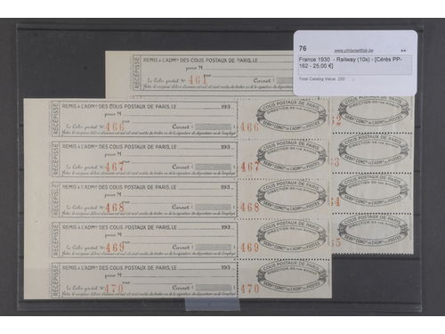 France. ★★. Back of the book only, considerable duplication with anything relating to railways, as listed in the Ceres specialised catalogue,all in pristine condition MNH from 1919 to 1930 offered in tryptic format (x3 se-tenant). Everything is listed and catalogued, as far as we can tell there is a minimum of 40,000 euro, probably nearer 50,000 euro resale value. This is a most unusual holding, the likes of which you will very probably not see again. If you are a dealer this is a great opportunity particularly if you have the time to market this online. Much of this material is very seldom seen, offered intact as received. Show less