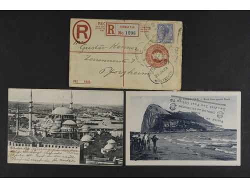 Gibraltar. Covers. Registered 2 d postal stationary also franked with 3 p sent to Germany 1922 via Plymouth. Also two postcards sent to Sweden 1903 and 1935 (paquebot). Show less