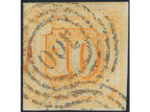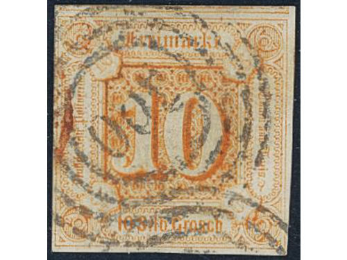 Germany, Thurn und Taxis. Michel 19 used, 1859 Numeral type 2nd issue 10 Gr orange. Cancelled with numeral 300 cancel, near cut at left. EUR 600 Germany, Thurn und Taxis. Michel 19 used, 1859 Numeral type 2nd issue 10 Gr orange. Cancelled with numeral 300 cancel, near cut at left. EUR 600 Show less