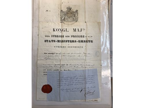 Documents, Sweden. Passport issued in Stockholm '30 de Maj 1853'. A lot of signatures. The entire lot is presented at www.philea.se.
