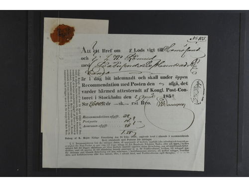 Sweden. Postal forms, lot RECIEPTS on visir leaves. 1850s–1870s incl. two for open registration with attached lists of t.. Read more Sweden. Postal forms, lot RECIEPTS on visir leaves. 1850s–1870s incl. two for open registration with attached lists of the content, one cancelled LANDSKRONA 2.12.1870 and one for a small parcel cancelled ANKARSRUM 30.9.1873. (10) Show less