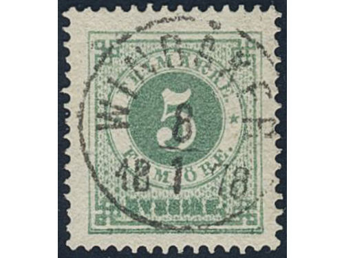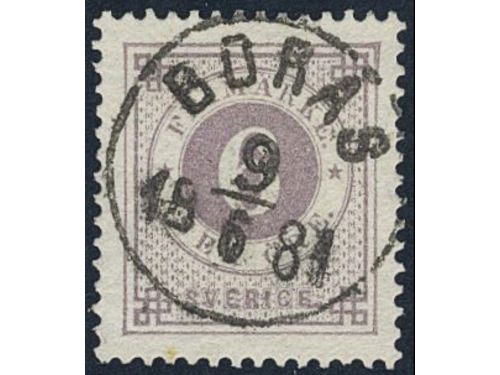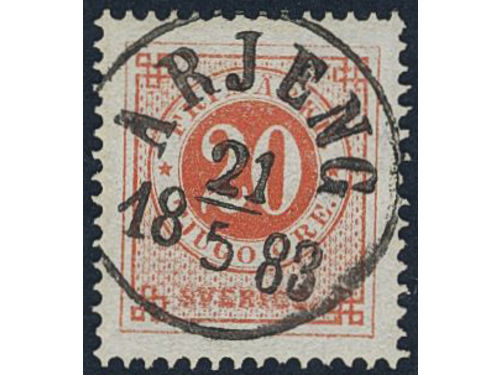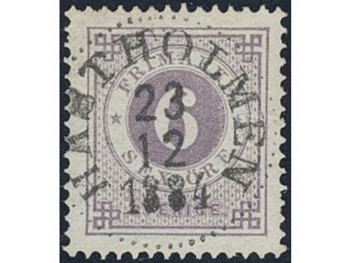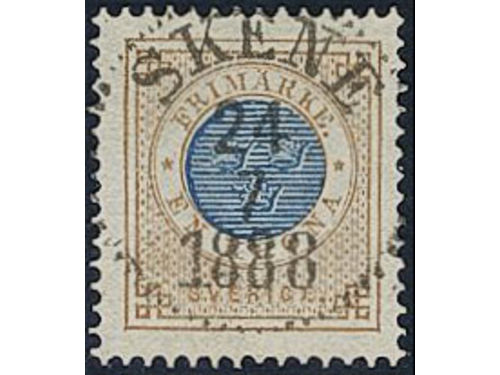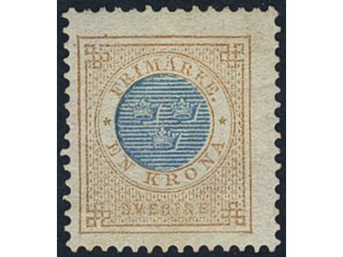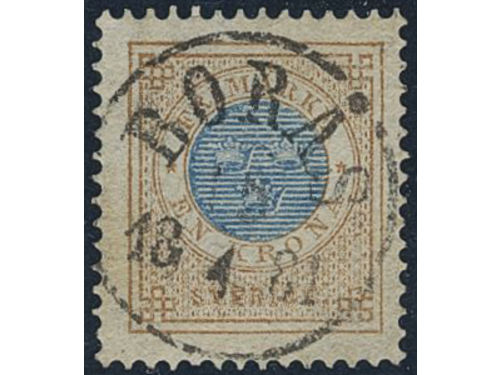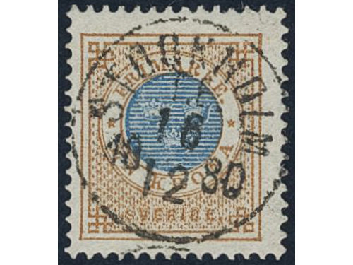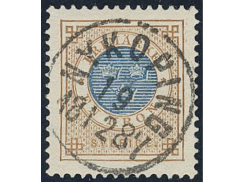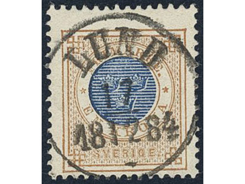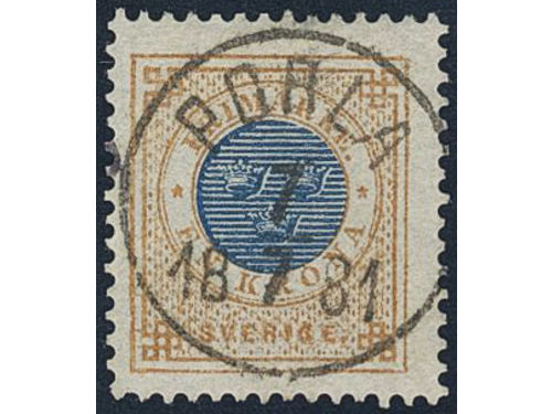 Sweden. Facit 37 used, 1 Riksdaler brown/blue. Beautiful example cancelled ULRICEHAMN 6.10.1878, with small part of a second mark. SEK 4000 Show less