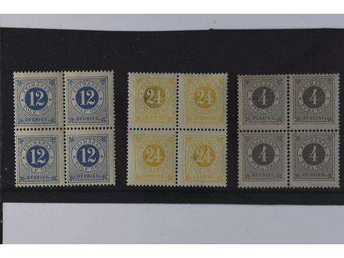 Sweden. Facit 32, 34, 42 ★★, 12, 24 and 4 öre with posthorn on back. Three blocks of four. SEK 15000