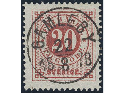 Sweden. Facit 35b1 v used, 30 öre black-brown with the paper slightly folded before printing. EXCELLENT cancellation ÖSTHAMMAR 18.10.1878. One somewhat short perf. Show less