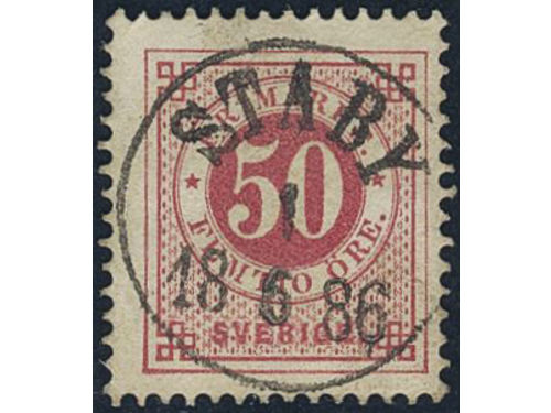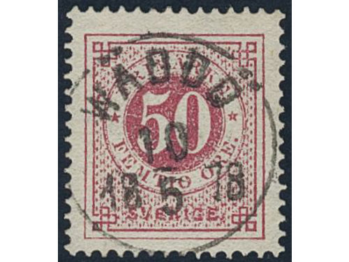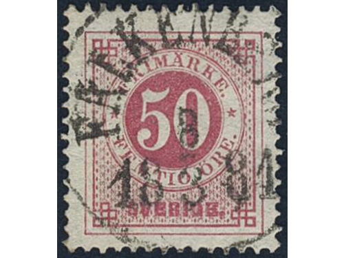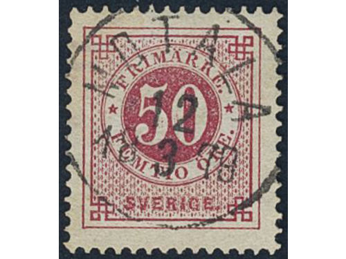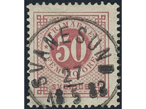 Sweden. Facit 36d used, 50 öre dull violetish carmine. Superb cancellation SVANESUND 27.5.1883. Some ink on the reverse.