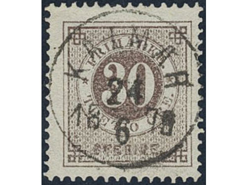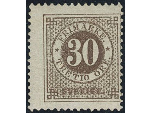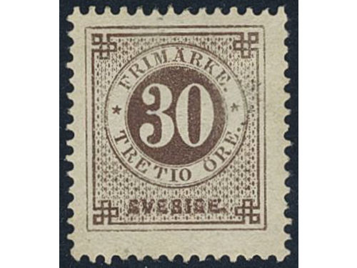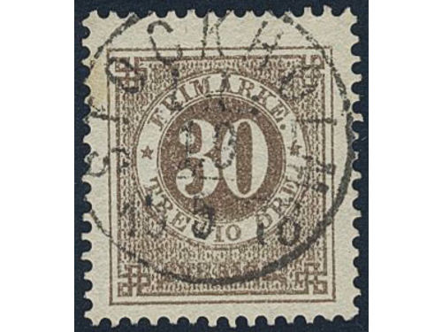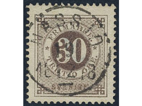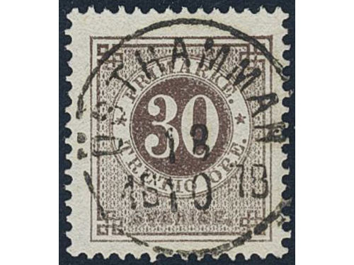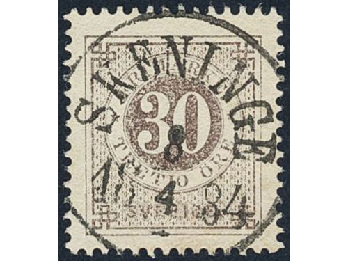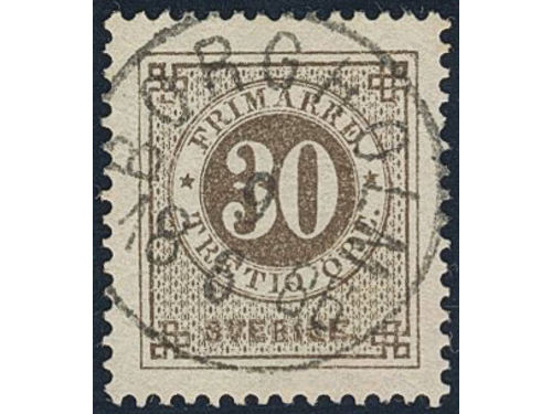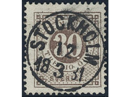 Sweden. Facit 35f used, 30 öre dull brown with thick numerals. EXCELLENT cancellation STOCKHOLM 12.3.1881.