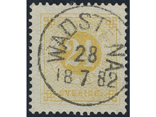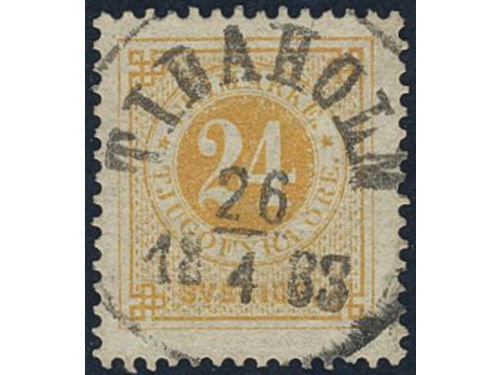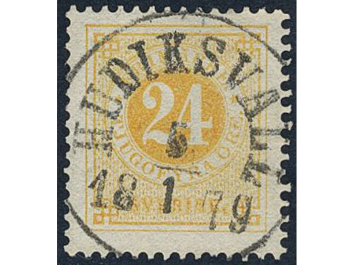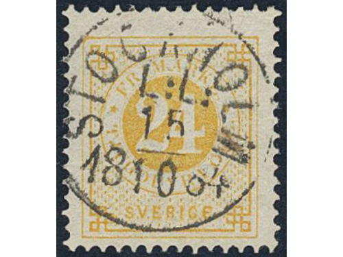 Sweden. Facit 34k used, 24 öre yellow on calendered paper. EXCELLENT cancellation FINSPONG 18.8.1887. Small owner mark on the reverse. Show less