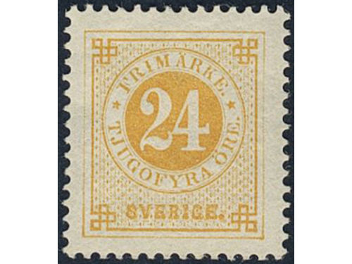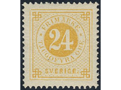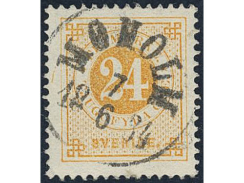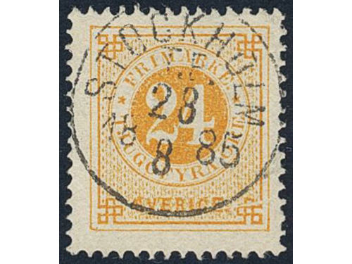 Sweden. Facit 34j v6 used, 24 öre orange-yellow on calendered paper, with paper folded before printing. Superb cancellation STOCKHOLM T.E. 28.8.1885. Scarce variety, not priced in Facit. Show less