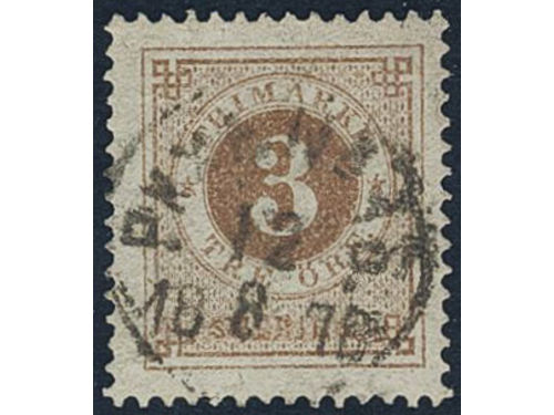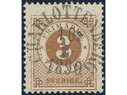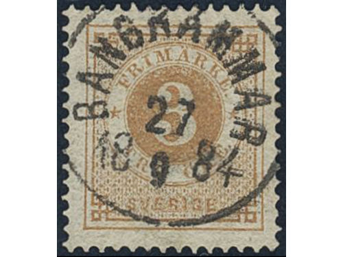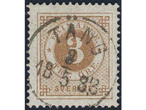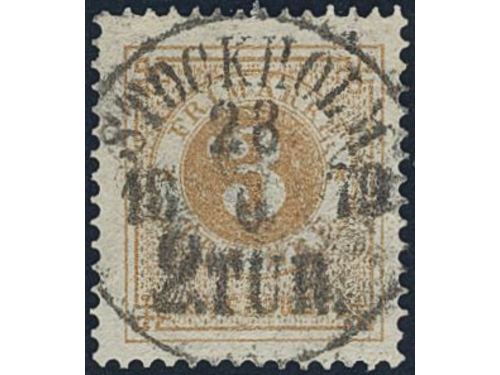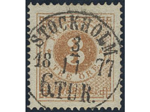 Sweden. Facit 28a used, 3 öre yellowish orange-brown. EXCELLENT cancellation STOCKHOLM 6.TUR 3.11.1877. Signed by O.P.