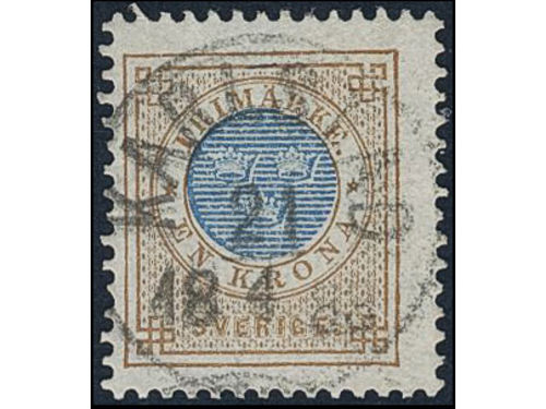 Sweden. Facit 38d used, 1 Krona grey-brown/blue. EXCELLENT cancellation KARLSTAD 21.4.1883, with part of a second pmk. Show less